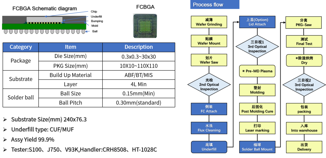 FCCSP(倒裝芯片級封裝)其主要的優(yōu)勢是產(chǎn)品的封裝尺寸接近與Die Size,采用在晶圓上做bump的技術,然后通過倒裝貼片設備使芯片正面朝下。通過bump和