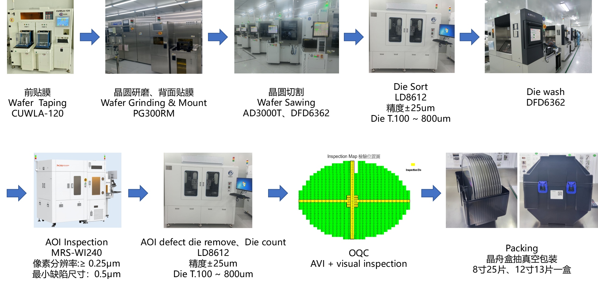 Recon Wafer Process(晶圓重構(gòu)): 華宇電子提供專業(yè)的8英寸和12英寸Recon Wafer?服務,覆蓋從晶圓來料檢測到成品包裝的全流程。 ?